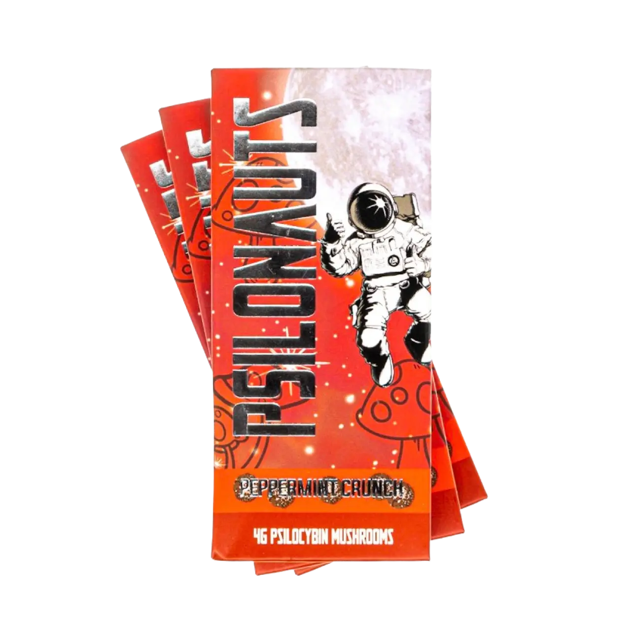 Experience a refreshing journey of taste and transformation with the Psilonauts Peppermint Crunch. This handcrafted chocolate bar blends cool peppermint flavor with crunchy texture and the powerful effects of 4 grams of psilocybin mushrooms.